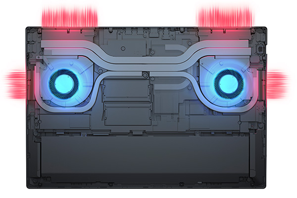 筐体底面の大きな吸気口に、3方向排気による合計5方向のエアフローの冷却により、高いパフォーマンスを長時間発揮
